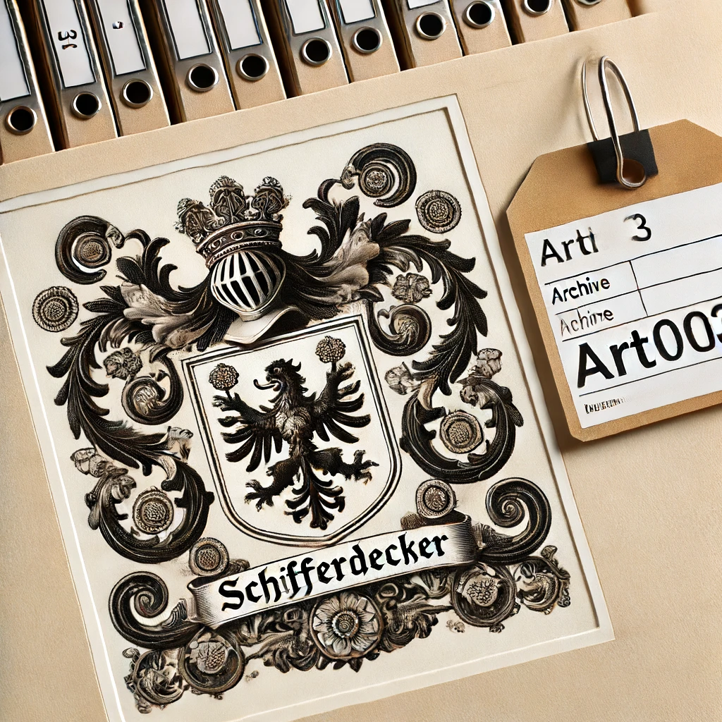 An intricate artwork of the Schifferdecker family crest, created by a renowned artist of the time.